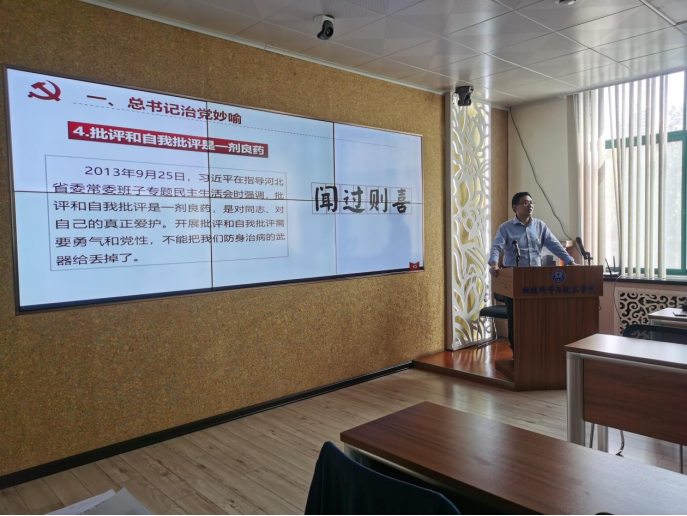 会议伊始,邀请马克思主义学院叶茂泉老师做题为《八个治党妙喻,坚持全面从严治党》的辅导报告。