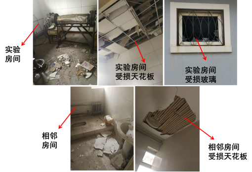 当日上午9点40分,事件当事四人来到实验室开展设备调试工作。在按规程加入C2H2和O2(1:1),总压力分别为0.02 MPa、0.1 MPa和0.2 MPa时,点火实验正常。点火时实验人员均撤出反应房间,在离房门3米外通过引出导线电子点火使反应迅速完成。下午,按总压力为0.3 MPa进行实验,15点40分点火,产生爆炸声(反应装置内喷出较大气流),造成所在房间玻璃破碎并溅射到门外草坪,房间顶部石膏天花板散落,房门发生破损,邻近2个房间的天花板发生掉落(图4)。