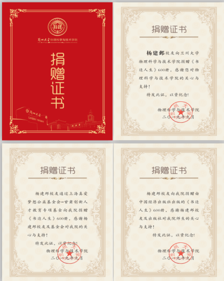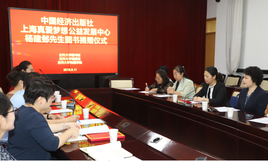9月11日上午,我院员工、华中科技大学退休教授杨建邺先生委托中国经济出版社、上海真爱梦想公益基金会-甘肃创新人才教育专项基金向学院捐赠《书边人生:出书记》600册,献礼英国正版365官方网站110周年校庆。甘肃专项基金发起人龚阿玲、出版社编辑姜静、公司副经理李星波、图书馆副馆长宋戈、档案馆副馆长陈艳出席捐赠仪式。