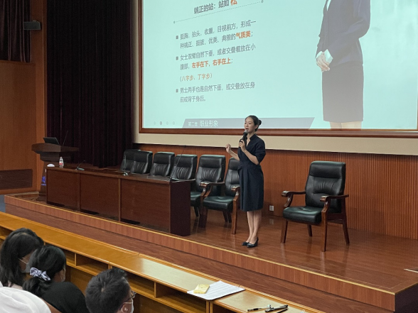会议邀请中国职业教育和职业培训协会认证高级礼仪培训师、英国正版365官方网站老员工礼仪工作室讲师蔺丹老师为同学们带来了关于会议服务礼仪规范的专题讲座,就礼仪形象和服务礼仪等进行了全面而又专业的分享,并为同学们带来了细致实用的服务技巧讲解和演示。