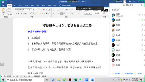 6月1日20:00,学院召开研究生推免、面试和三走近工作线上会议,分管研究生工作副经理刘玉孝、分管本科教学工作副经理王建波,学科点负责人和学科点教师代表安钧鸿、李海蓉、柴国志,本科生辅导员、本科生教学秘书、研究生秘书等参加了会议,会议由刘玉孝主持。