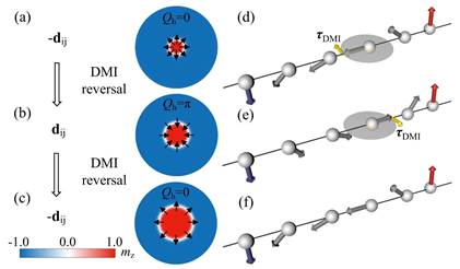 图1. (a)-(c)由DMI手性翻转诱导的磁斯格明子膨胀现象;(d)-(f)分别对应于(a)-(c)的磁斯格明子手性翻转示意图。