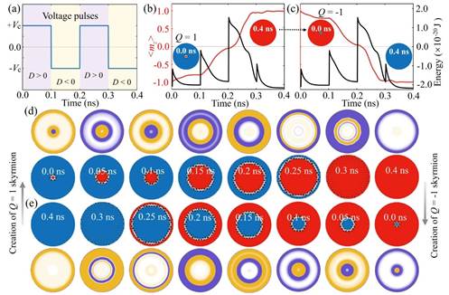 图3. (a)用于垂直磁矩翻转操控的电压脉冲序列;(b,c)电压脉冲控制下的垂直磁矩可重复性翻转;(d,e)对应于(b,c)的磁矩和DMI有效场分布。