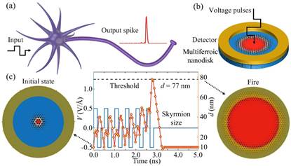 图4. (a)生物神经元的结构和功能;(b)基于磁斯格明子膨胀机制的人工神经元示意图;(c)神经元的“漏-收集-激发”功能模拟。