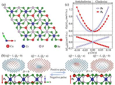 图2. (a) 二维CuCrP2Se6结构的俯视图;(b)电压脉冲操控的垂直电极化翻转及相应的磁斯格明子手性翻转示意图;(c)基于第一性原理计算的上电极化和下电极化对应的自旋螺旋态能和DMI能。