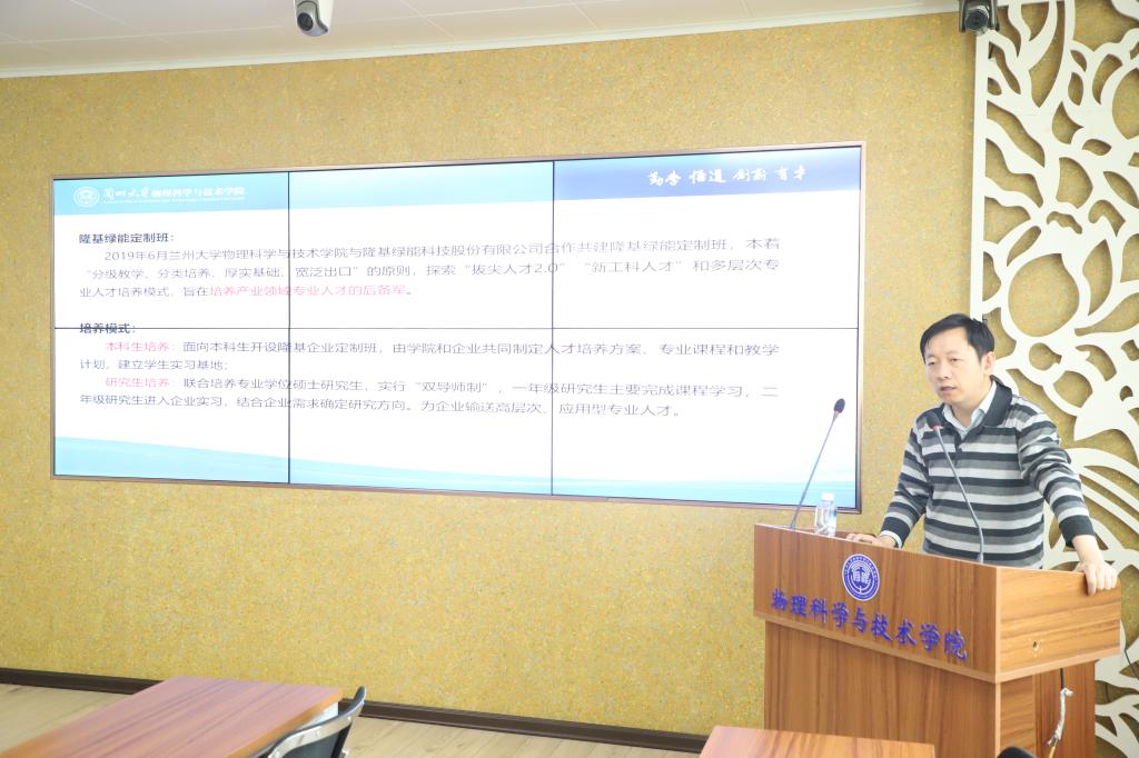 王建波从人才培养的角度,围绕设立背景、培养模式、课程清单、目前进展、开展活动和取得的成就等方面介绍了隆基定制班的情况。张振兴教授结合课程培训和开展项目对2023年度兰大—隆基合作项目情况做了详细汇报。