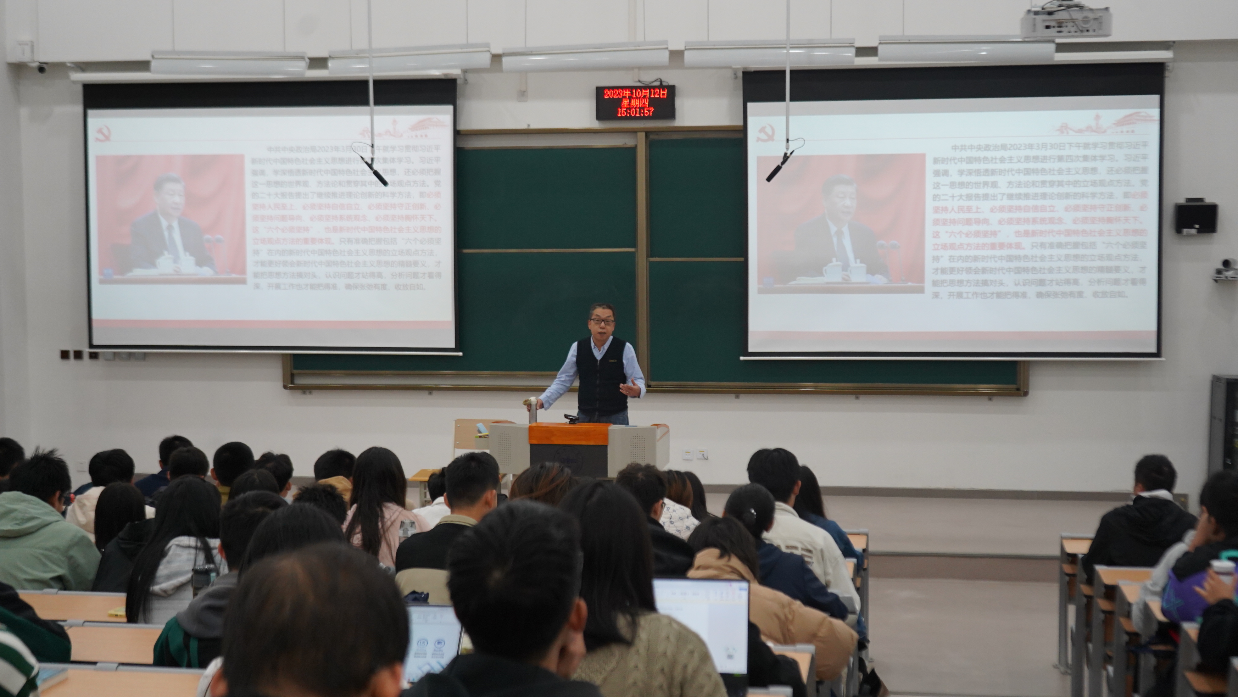 围绕“六个必须坚持”,吴国军引经据典、循循善诱,对习近平新时代中国特色社会主义思想的科学体系、核心要义进行生动、详细的讲解,指出这深刻揭示了习近平新时代中国特色社会主义思想的理论品格和鲜明特质,既是深刻理解这一科学思想必须牢牢把握的基本点,也是继续推进理论创新必须始终坚持的基本点。最后,他结合英国上市公司官网365开展综合改革以来取得的一系列成果,向同学们再次强调了掌握科学的世界观和方法论的重要性,鼓励同学们要结合个人专业学习,坚定信念、脚踏实地,为强国建设、民族复兴贡献物理人的力量。
