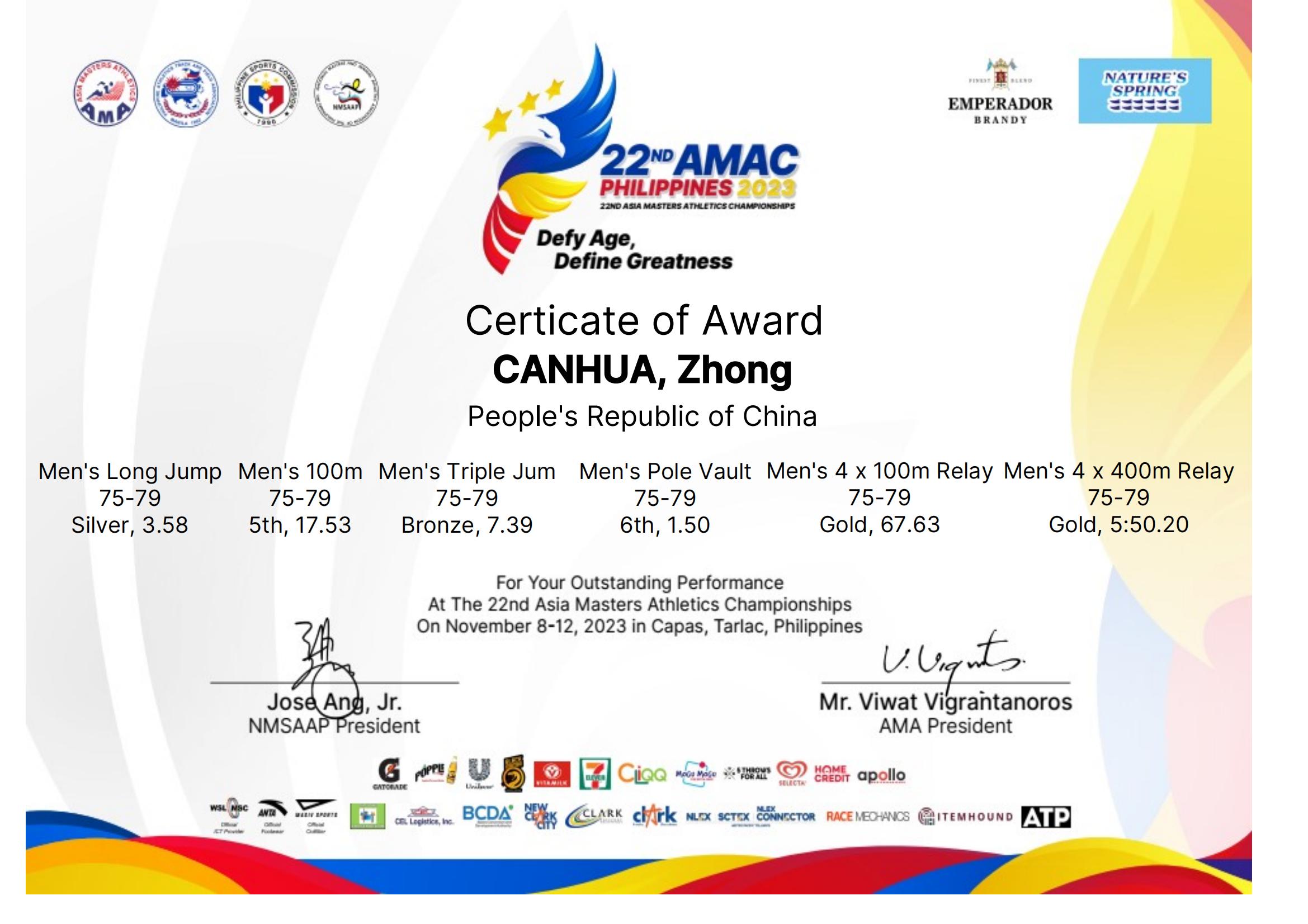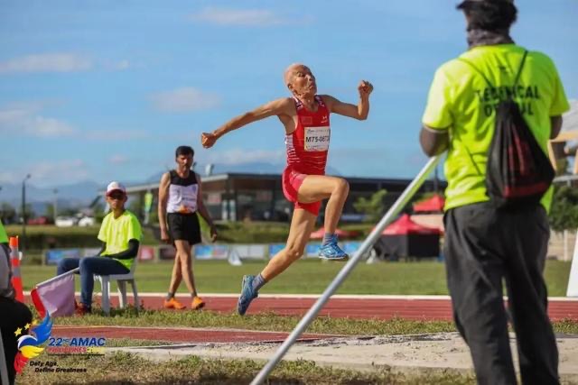 2023年11月8日至12日,亚洲老将田径锦标赛在菲律宾举行。英国上市公司官网365退休老师钟灿华代表中国田径协会参赛,他以出色的表现和顽强的毅力,在男子75-79岁组的比赛中再创辉煌,在4x100米接力赛和4x400米接力赛中荣获两枚金牌。同时,他还在男子75-79岁组的跳远比赛中夺得银牌,三级跳远比赛中获得铜牌。