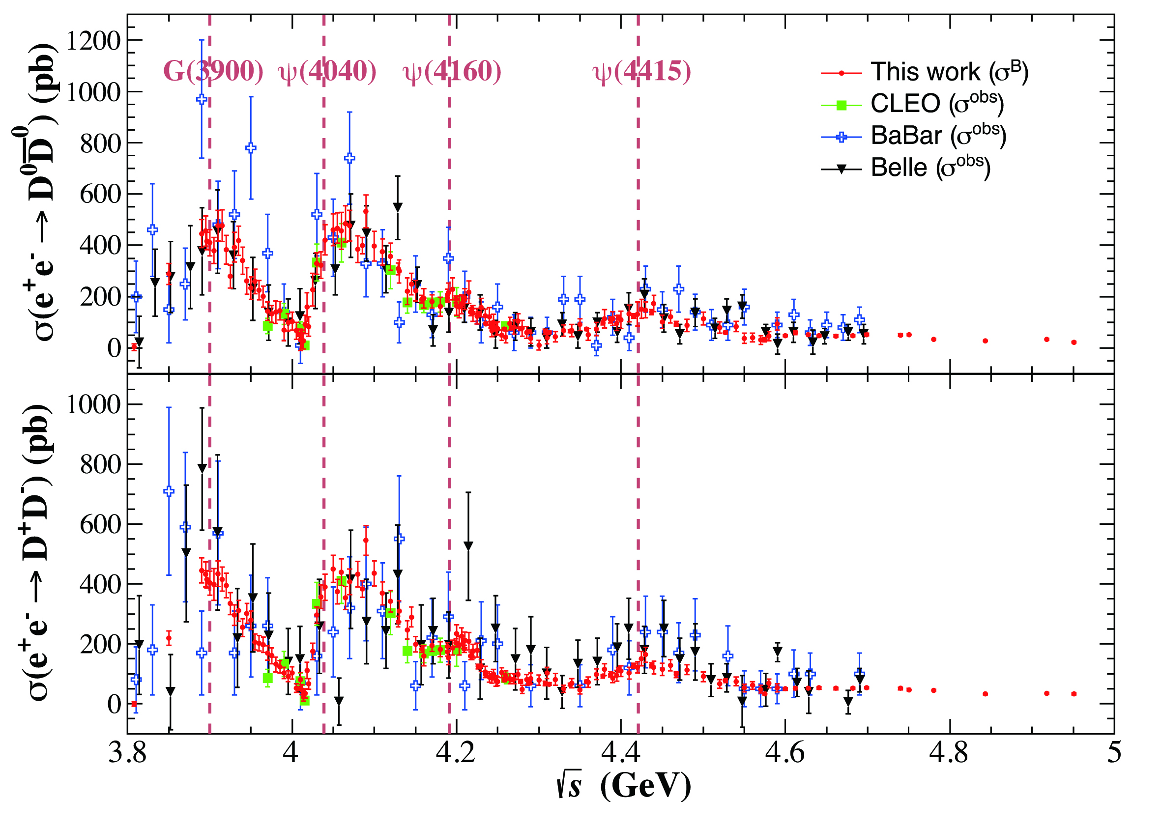 图为不同国际实验组对正负电子湮灭到粲介子对截面测量结果对比