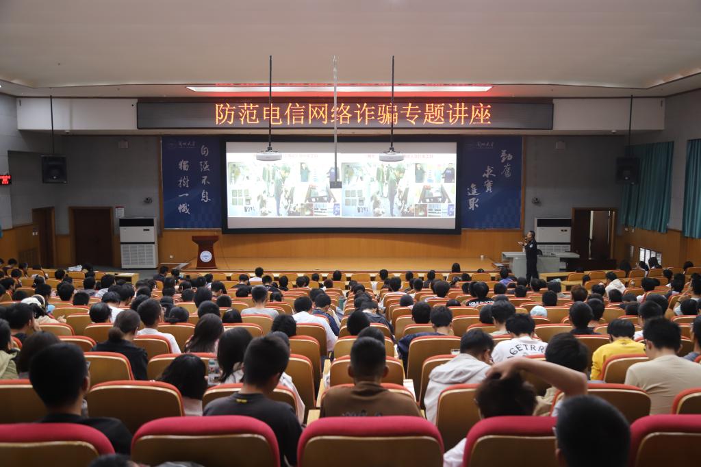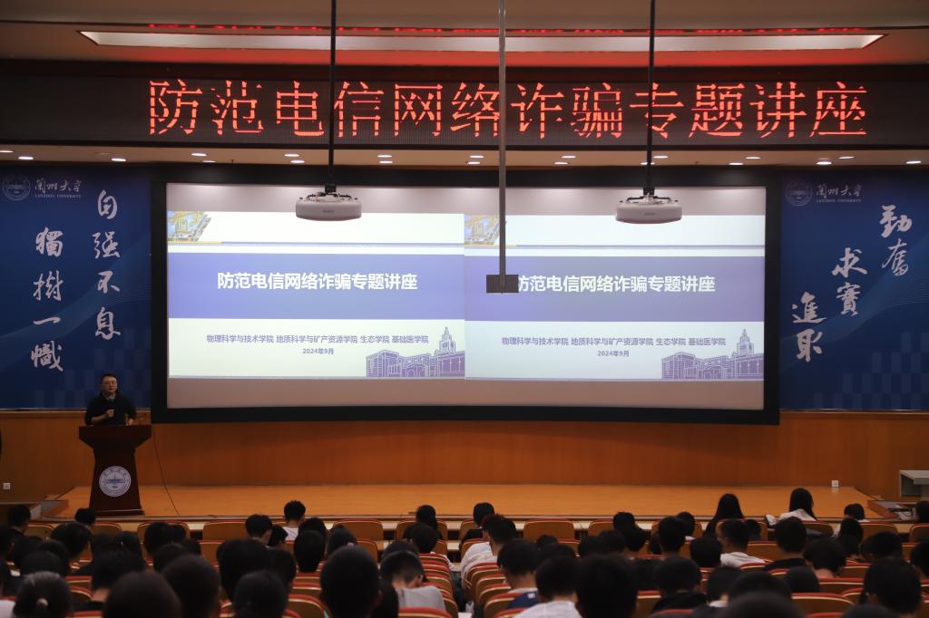 9月19日,物理科学与技术学院联合地质科学与矿产资源学院、生态学院、基础医学院在天山堂C302报告厅举办防范电信网络诈骗专题讲座,讲座邀请榆中县公安局反诈中心民警陈冠宇主讲,四个学院全体2024级本科生和榆中校区研究生参加讲座。