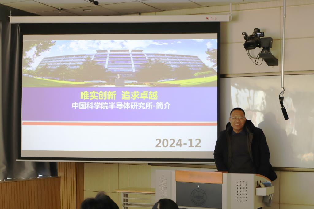 当日下午,张永亮一行专程赴榆中校区为本科生做了《光学新视界:微纳光学简介》《自旋电子学:从微观物理到新型计算范式应用》《宽禁带半导体材料与光电子器件》三个报告并介绍中国科学院半导体研究所发展现状,与在座师生进行了互动交流。