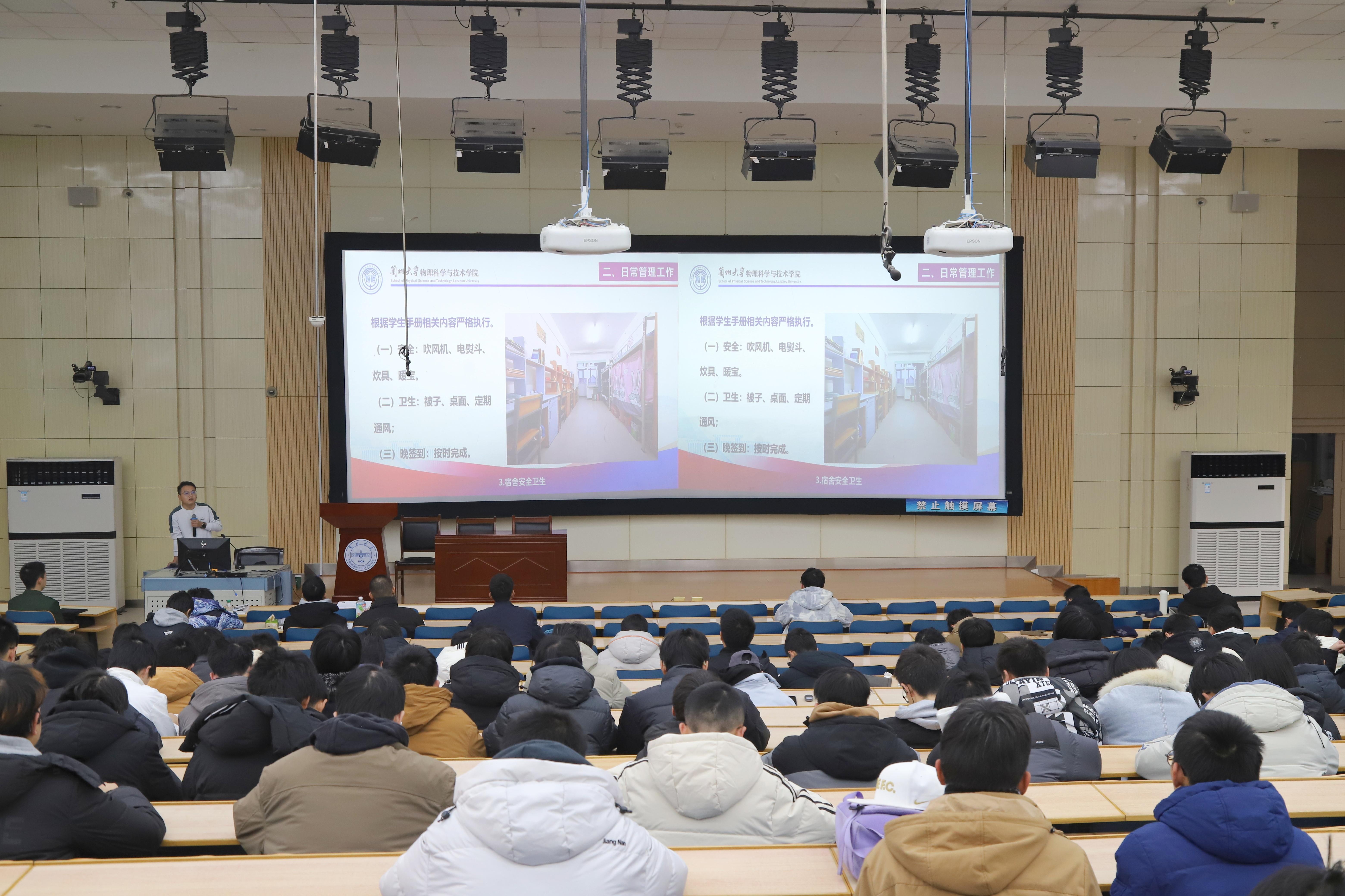 2024级本科生辅导员樊金雷就日常管理工作进行了安排。他详细说明了课堂请假和外出请假的具体流程,强调了宿舍安全卫生和晚签到等事项,要求同学们严格遵守员工手册规定。在安全意识方面,他通过介绍相关案例,提醒同学们要防范电信诈骗,树立理性消费意识。最后,他详细介绍了学校、公司综合测评体系和办法,鼓励同学们注重全面发展。