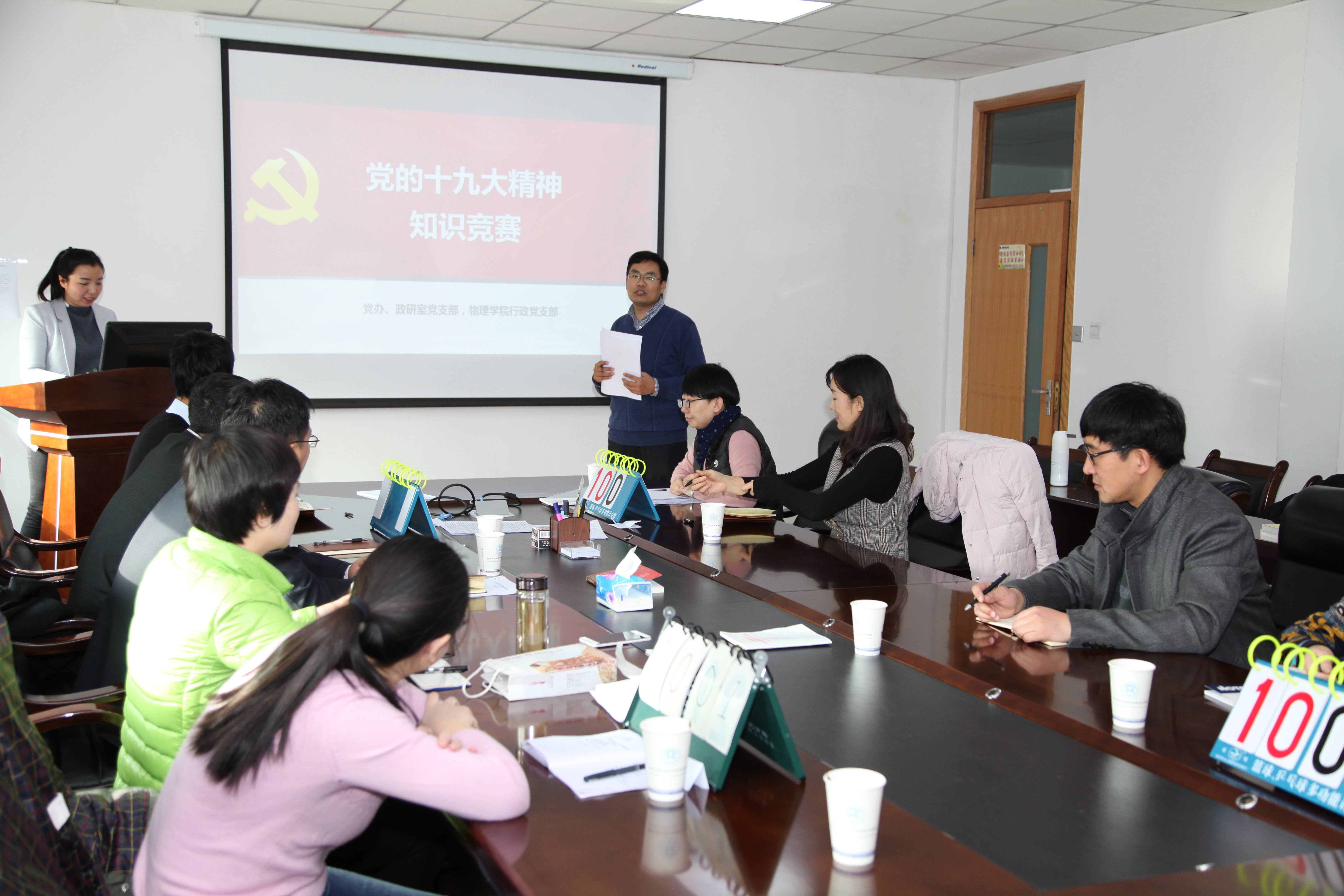 12月14日下午,党办政研室党支部、英国上市公司官网365第六教工党支部在格致楼会议室以“新时代、新状态、新干劲”为主题,以党的十九大精神知识竞赛为载体,联合开展了一次别开生面的组织生活会,取得了良好效果。