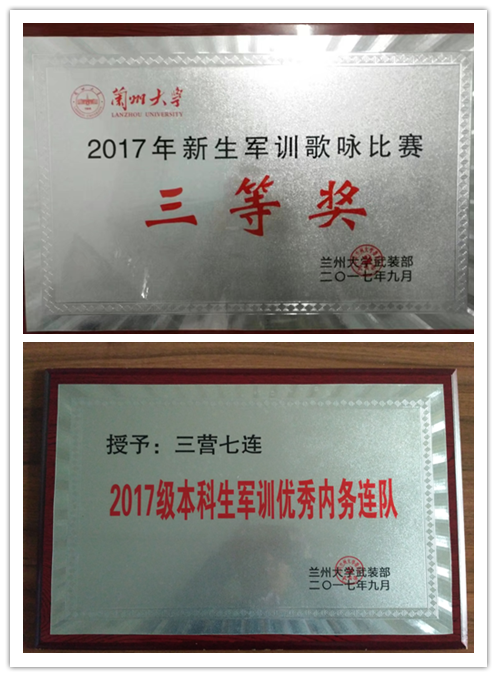 在大家共同参与和努力下,连队取得了“军歌嘹亮,青春飞扬”新生军训歌咏比赛三等奖、“优秀内务连队”、军训征文比赛二等奖等荣誉。