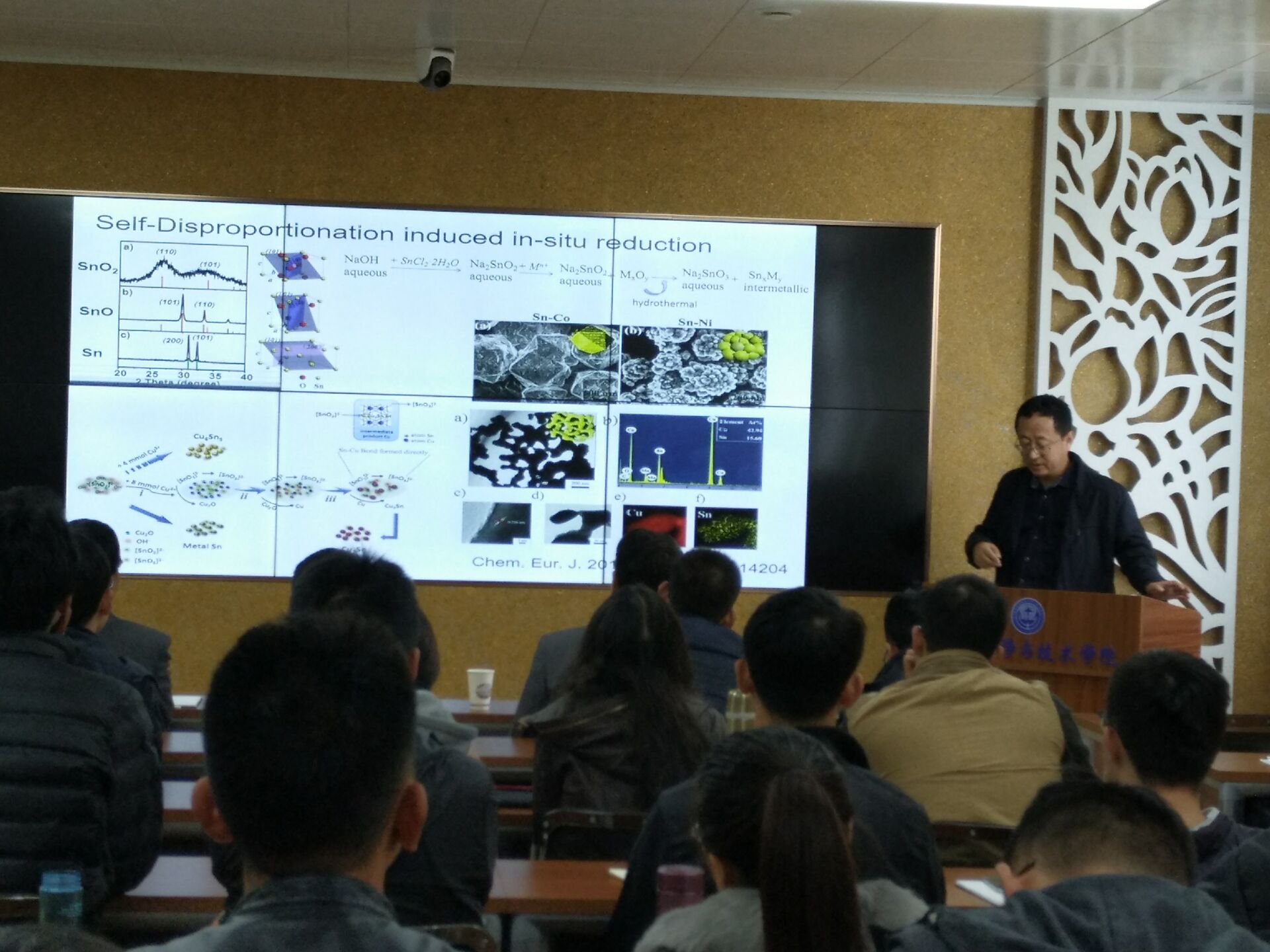 随后,西安交通大学汪敏强教授为大家作了题为“纳米复合光电功能材料及应用”的学术报告。他向大家介绍了其所在课题组的研究内容及成果。重点介绍了量子点太阳能敏化电池研究,对TiO2/(ZnO)多孔厚膜沉积敏化量子点,0D-1D纳米复合结构ZnO/TiO2复合电极和CdSxSe1-x量子点光敏化材料展开详细的讲解。此外,汪教授系统性的介绍了实验室在新型高效纳米复合光催化材料和新型银纳米结构的制备及SERS检测方面的研究进展。