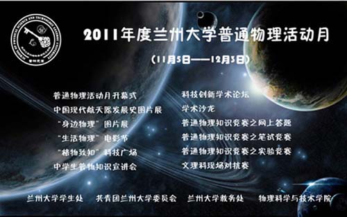 本次的普物活动月系列活动得到了校团委、员工处、教务处的大力支持,也得到了西北民族大学电气工程学院的协助,活动从10月25日开始,将持续到12月3日结束。活动内容十分丰富,包括物致知科技广场、中国航天器发展史图片展、普通物理知识有奖竞答、科技创新学术论坛、学术沙龙、身边的物理图片展、生活中的物理电影节、笔试竞赛、实验竞赛、团体对抗赛以及中员工普物知识宣讲会等十余项内容,将把物理广袤而深邃的世界一并展现给大家,并使同学们亲身感受身边的物理带给我们的无限乐趣。