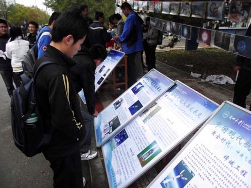 视野小广场上,长长的图片长廊展示了我们目之所及的各种身边物理现象,引得一位小朋友也注目连连,不时好奇地询问,学长就热心地为小朋友讲解。同时,因为恰逢我国第一目标飞行器“天宫一号”成功发射,本次活动还新增了一个“中国现代航天器发展史的图片展”,展示了我国航天发展史的青铜时代,白银时代和黄金时代。另外,现场还设置了关于物理知识的有奖问答活动,可以现场报名参加,每答对一道题就会得到一个小礼品。尽管阴雨连连,天气寒冷,视野小广场上还是聚集了很多热爱物理的学子们。许多同学早已摩拳擦掌、跃跃欲试了。上午10点左右,越来越多的同学来到了现场,参与到了活动中。现场气氛活跃,不时听得到同学们因答对题目的欢呼声。