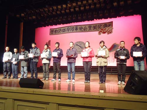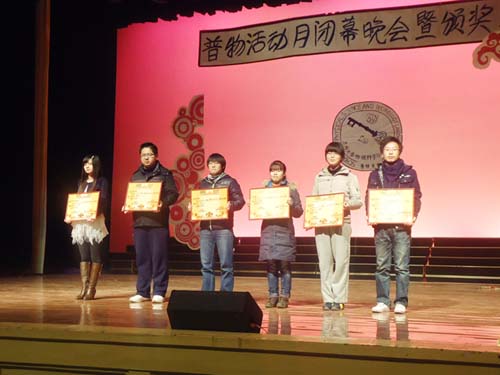 一曲动感摇滚的乐队弹唱点燃了晚会的激情,揭开了本次颁奖典礼的序幕,校团委副书记李华龙老师为笔试新生及文科组的获奖代表颁发了奖品和证书。2011级材料化学班的同学们给我们带来了小品《超级智囊团》,校园十大歌手冠军,“奶茶哥”李建文也来到了颁奖晚会的现场,为同学们盛情地献上一首《爱爱爱》。随后,英国正版365官方网站信息化领导小组办公室副主任张聪闪老师为获得笔试竞赛普通组和专业组的获奖代表颁发了奖品和证书。