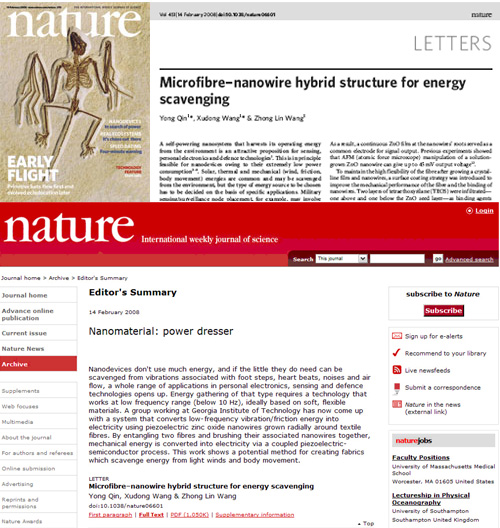 公司青年教师秦勇博士在美国佐治亚理工学院王中林教授的研究小组学习工作期间,在2月14日出版的《Nature》上发表了题为“Microfibre–nanowire hybrid structure for energy scavenging”的学术论文。这是公司教师首次以第一作者在《Nature》上发表论文。