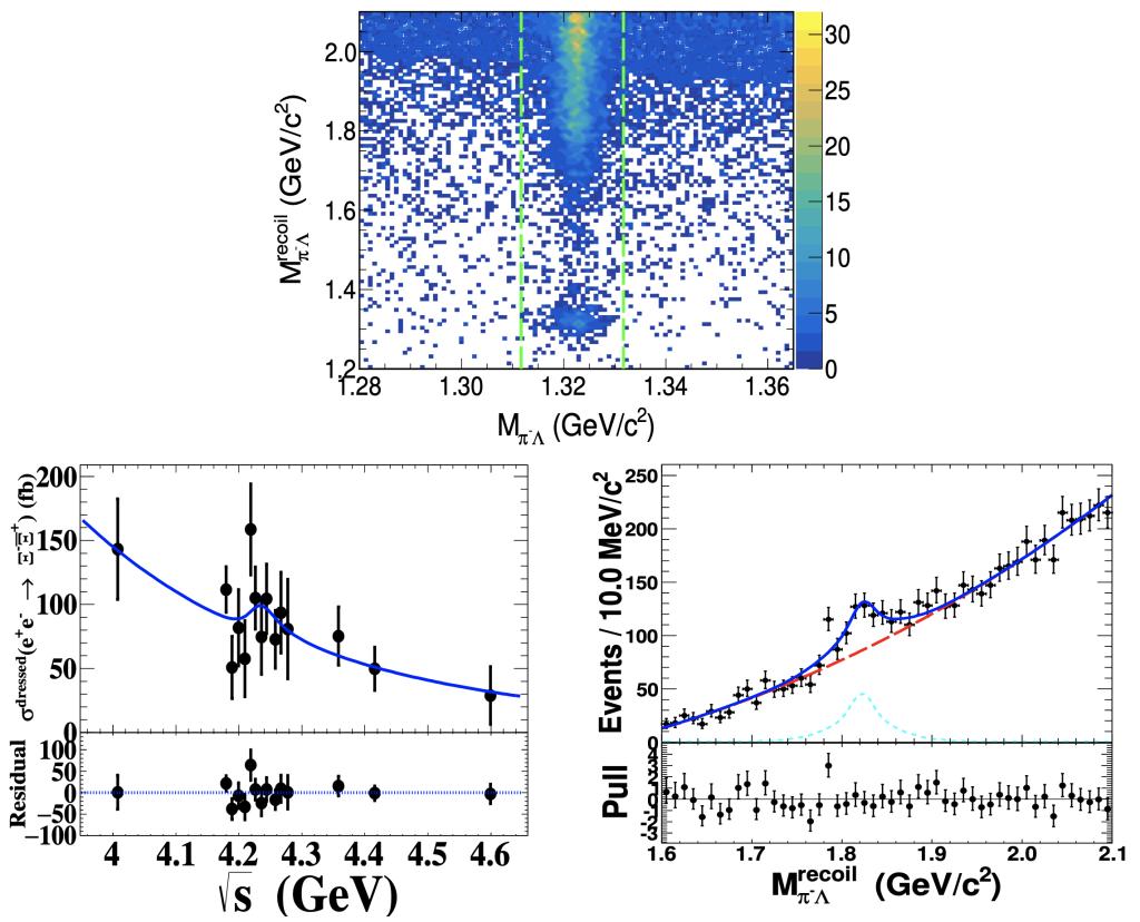 近年来,国际各大高能物理实验发现了众多的类粲偶素态。但这些态到底是什么,目前理论方面还没有统一的定论,因此类粲偶素态的研究也成为了高能物理实验的前沿课题。该研究利用了北京正负电子对撞机第三代北京谱仪(BESIII)实验在质心能量为[4.009,4.6]GeV区间采集的数据样本,首次测量了正负电子对湮灭到正反Xi超子对末态的遍举玻恩截面,并研究了类粲偶素Y(4230/4260)衰变为正反Xi超子过程。此外,从挑选出来的信号事例中发现了一个新的重子激发态,这一实验结果有助于确认类粲偶素态的性质和检验夸克模型的理论预言。