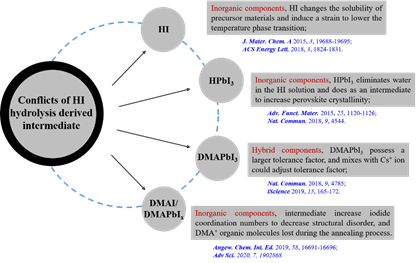 无机CsPbI3因具有连续可调的禁带宽度、高的光电转化效率、优异的载流子传输性能及稳定性等优点,在光电转换领域受到了广泛关注。目前抑制CsPbI3热力学相变是推进其应用化进程的关键。在所有可行的解决策略中,基于HI水解制备的中间相作为前驱体来稳定CsPbI3晶体结构、优化薄膜质量和改善器件性能的方法最为简便且应用最广泛。然而,这类中间相的组分及作用机理一直以来存在争议,经历了从无机到有机-无机杂化组分,最后再回到无机组分的认识变化,进而CsPbI3光电转化材料类型也伴随着争议,(如图1所示)。