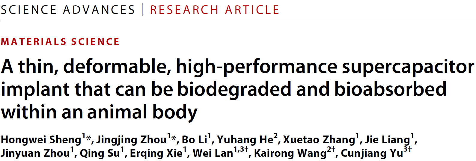 近日,英国正版365官方网站物理科学与技术学院兰伟教授课题组联合美国休斯顿大学余存江教授和英国正版365官方网站基础医学院王凯荣教授报道了一种轻薄、柔性的全生物可降解超级电容器植入物,兼具高的能量密度和功率密度。该器件全部由绿色、安全、生物相容性的材料构成,工作任务完成后可在生物体内完全降解被吸收,经自然新陈代谢排出体外,无需二次手术移除,具有安全、健康、避免手术痛苦和降低医疗成本等特点。该研究成果以“A thin, deformable, high-performance supercapacitor implant that can be biodegraded and bioabsorbed within an animal body”为题于2021年1月8日发表在Science子刊Science Advances上。该研究有望为下一代生物可降解植入式医疗电子器件或其它瞬态电子器件的供能问题提供能量解决方案。