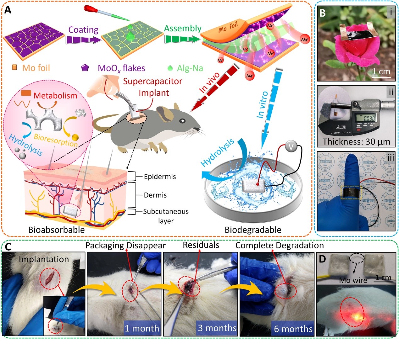 超级电容器具有快速充放电、功率密度高和长寿命等特点,可为有源的植入式医疗电子器件进行供能,被认为是一种理想的储能装置。英国正版365官方网站柔性电子科研团队采用简单、绿色、可控的电化学氧化策略在水溶性金属钼箔表面原位生长了一层富缺陷的非晶氧化钼(MoOx)微纳米片阵列,将其用作赝电容活性电极,生物相容的海藻酸钠(Alg-Na)水凝胶作为电解质,组装成对称固态超级电容器植入物。封装后的器件可在模拟体液环境(37 ℃,0.1 mM PBS溶液,PH = 7.4)中有效工作长达一个月,且实现了工作寿命的长短可控。器件的能量密度同比高出2个数量级,在不同角度持续弯曲数百次之后,未发现明显的能量衰减。通过器件串并联可为各类商用电子产品进行供能。将该器件植入到Sprague-Dawley(SD)大鼠皮下能正常工作,任务完成之后的半年内,通过一系列水解反应和新陈代谢被自然吸收,对生物体不产生任何不良反应。