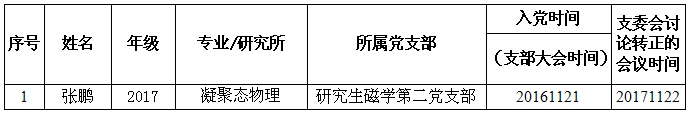 公司研究生磁学第二党支部于2017年11月22日召开支委会议,讨论本支部张鹏同志预备期满按期转正的问题,现对预备党员按期转正进行公示。