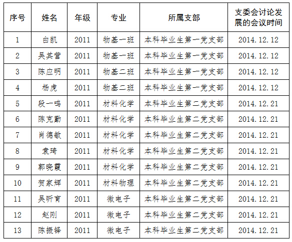 公司各党支部于2014年12月12—12月21日召开支委会议,决定接收白凯等13名同志为预备党员,现对以下发展对象进行公示。