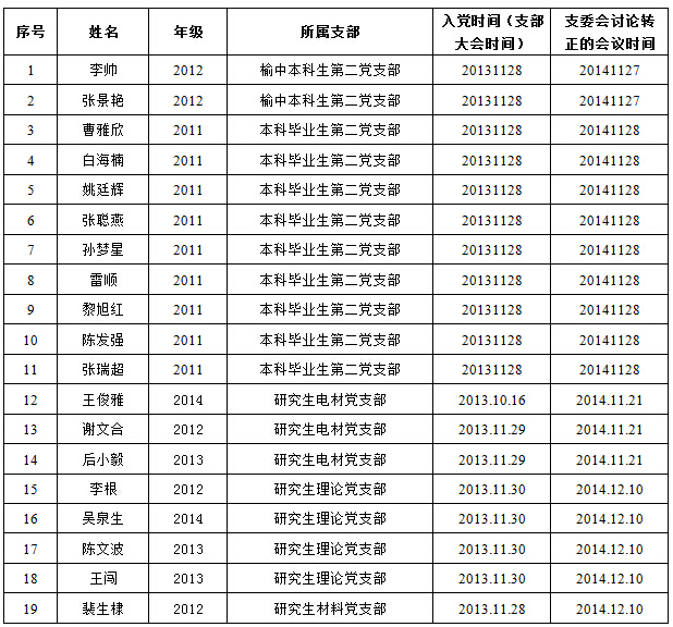 公司各党支部于2014年11月27日—12月21日召开支委会议,讨论本支部预备党员的按期转正问题,现对预备党员进行公示。