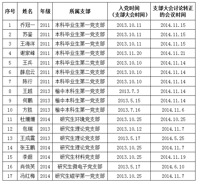 各党支部于2014年5月25日、6月10日、2014年10月25-11月21日召开支部大会,讨论本支部预备党员按期转正问题,并报公司党委预审。经公司党委预审,拟批准乔冠一等17名同学按期转为正式党员,现对拟转正党员名单做出公示。
