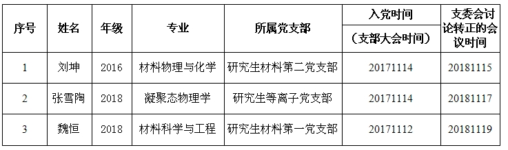 公司研究生材料第一党支部、等离子党支部、材料第二党支部分别于2018年11月15日、11月17日、11月19日召开支委会议,讨论本支部预备党员的按期转正问题,现对预备党员按期转正进行公示。
