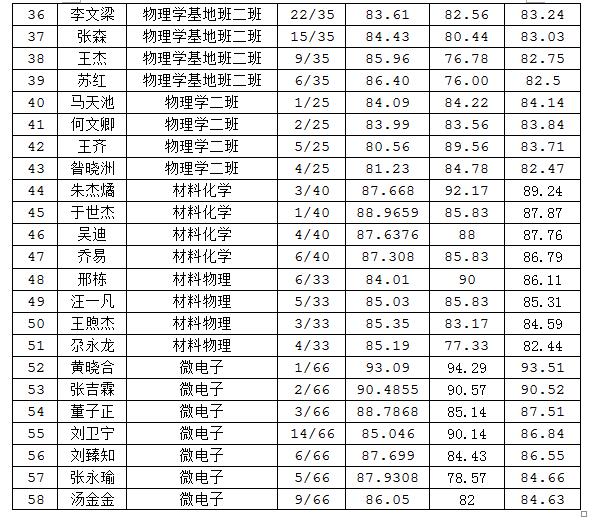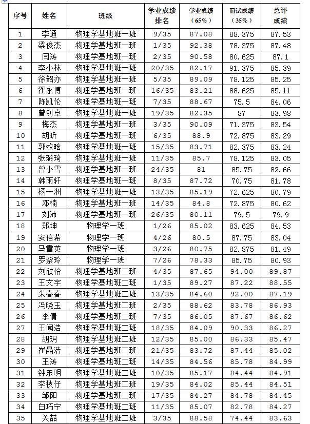 根据《教育部办公厅关于做好2019年推荐优秀应届本科毕业生免试攻读研究生工作的通知》(教学厅〔2018〕10号)和《关于做好2019年推荐优秀应届本科毕业生免试攻读研究生工作的通知》(校教〔2018〕61号),遵照《物理科学与技术学院2019届本科生推荐免试攻读研究生工作实施方案》,经过员工自愿申请,学院严格按照推荐免试工作要求和流程,本着公开、公平、公正的原则,综合员工学业成绩(65%)和面试成绩(35%),得到总评成绩。经学院推免工作小组审核,现将物理科学与技术学院2019年推荐免试攻读研究生考核成绩和拟推荐名单予以公示。