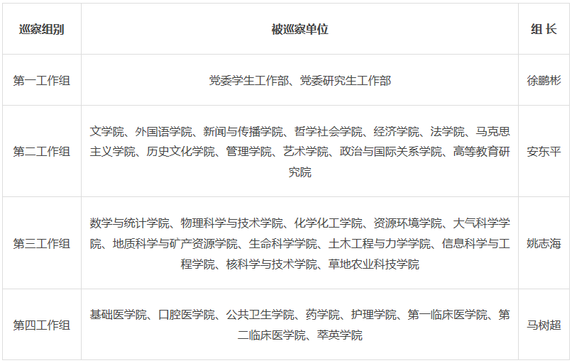巡察组组长胡万军,副组长徐鹏彬、安东平、姚志海、马树超,下设4个工作组,任务分工及联系方式如下: