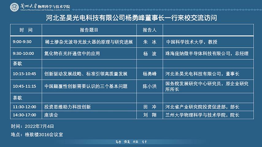 应物理科学与技术学院邀请,河北圣昊光电科技有限公司董事长杨勇峰一行将来校访问,就半导体材料、新型器件、光通信、集成电路、产业发展与创业投资等主题开展交流与讨论,推动院-企合作,提升学院服务企业能力和企业科研创新能力,为建设创新型国家做出积极贡献。