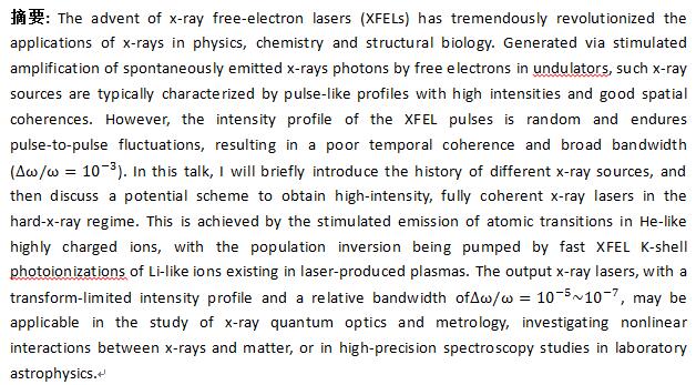 报告人简介:吕纯海,2006-2013年就读于英国正版365官方网站物理与科学技术学院,获本科及硕士学位。2014年至今在德国马克思普朗克核物理所从事X射线量子光学相关研究,并于2018年获得海德堡大学物理学博士学位。研究兴趣包括X射线激光,超快原子分子过程,自由电子激光与原子分子相互作用,激光等离子体频谱,EUV离子钟等。