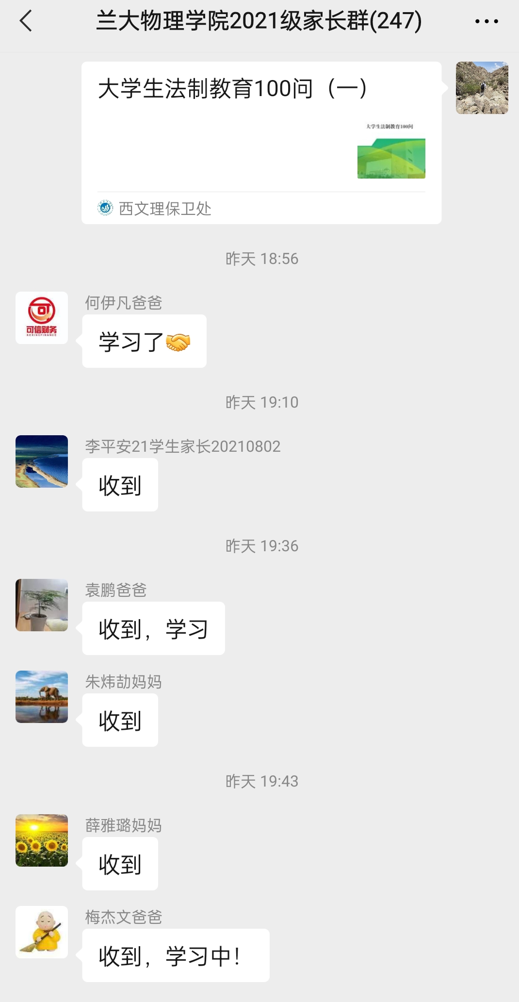 3.“送法进家庭”。通过家校联系群向家长推送法律知识和科学教育方法,同步提升家长的法律意识和法律素质,建立“法制教育网络”,通过家校联动,营造良好法治氛围。