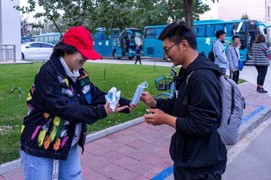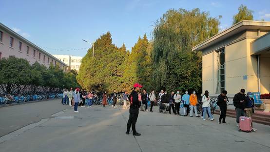 早上六点钟,当第一缕晨光射穿薄雾洒落在校园里时,志愿者们就已经在服务点前开始忙碌了。志愿者们分工明确,男生负责协助搬运行李、帮助司机师傅清点上车人数,女生负责维持秩序,让同学们有序排队等车,并为有需要的同学提供口罩、饮用水等物资;乘车的同学中大一新生也占了很大的比例,对于出行路线、校园卡充值等方面的问题志愿者也都耐心细致地一一给予解答。