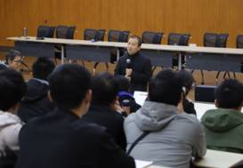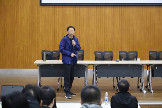 在“一士班”宣讲环节,罗洪刚经理结合我国改革开放40多年来社会的发展变革,介绍了设立“一士班”的背景、初衷以及运行方案。他指出学院为顺应新时代发展对各类人才的需求、高等教育发展对人才培养的新要求,启动了公司产品改革,本着“分级教学、分类培养、厚实基础、宽泛出口”的原则,既培养具有物理学思维和方法的应用型人才,也培养有志于从事基础研究的学术型人才。结合员工个人兴趣爱好和发展规划,学院提供了丰富的资源和广阔的平台。学院成立院企合作定制班,积极培养应用型人才,为企业输送新鲜血液。而“一士班”的成立,则是为有志于从事基础研究的同学搭建平台,培养对物理学基础研究有热情、有情怀的后备人才,是学院实施“分类培养”中“厚实基础”的重要举措。罗洪刚以“段一士先生谈治学之道”为题,从段先生的学术生涯、学术成就、治学之道等方面娓娓道来,鼓励同学们要传承、发扬段一士先生的治学精神,掌握物理学的思维和方法,增强创新意识,同时要加强学习、理解、交流等方面综合能力的提升。