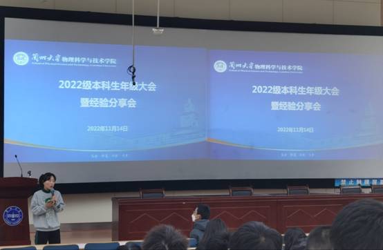 为引导2022级新生进一步适应大学学习和生活,针对性帮助同学们解决在学习生活中遇到的困难,经过前期调研和分析,11月13日上午,物理科学与技术学院在榆中校区天山堂C301举行2022级本科生年级大会暨经验分享会。会议邀请了2019级理论物理班米焱、2020级微电子科学与工程1班丁启航、2021级微电子科学与工程1班陈豪隆,萃英学院2019级物理学班柴新宇等四名同学进行分享,会议由2022级本科生辅导员李玉琼主持。