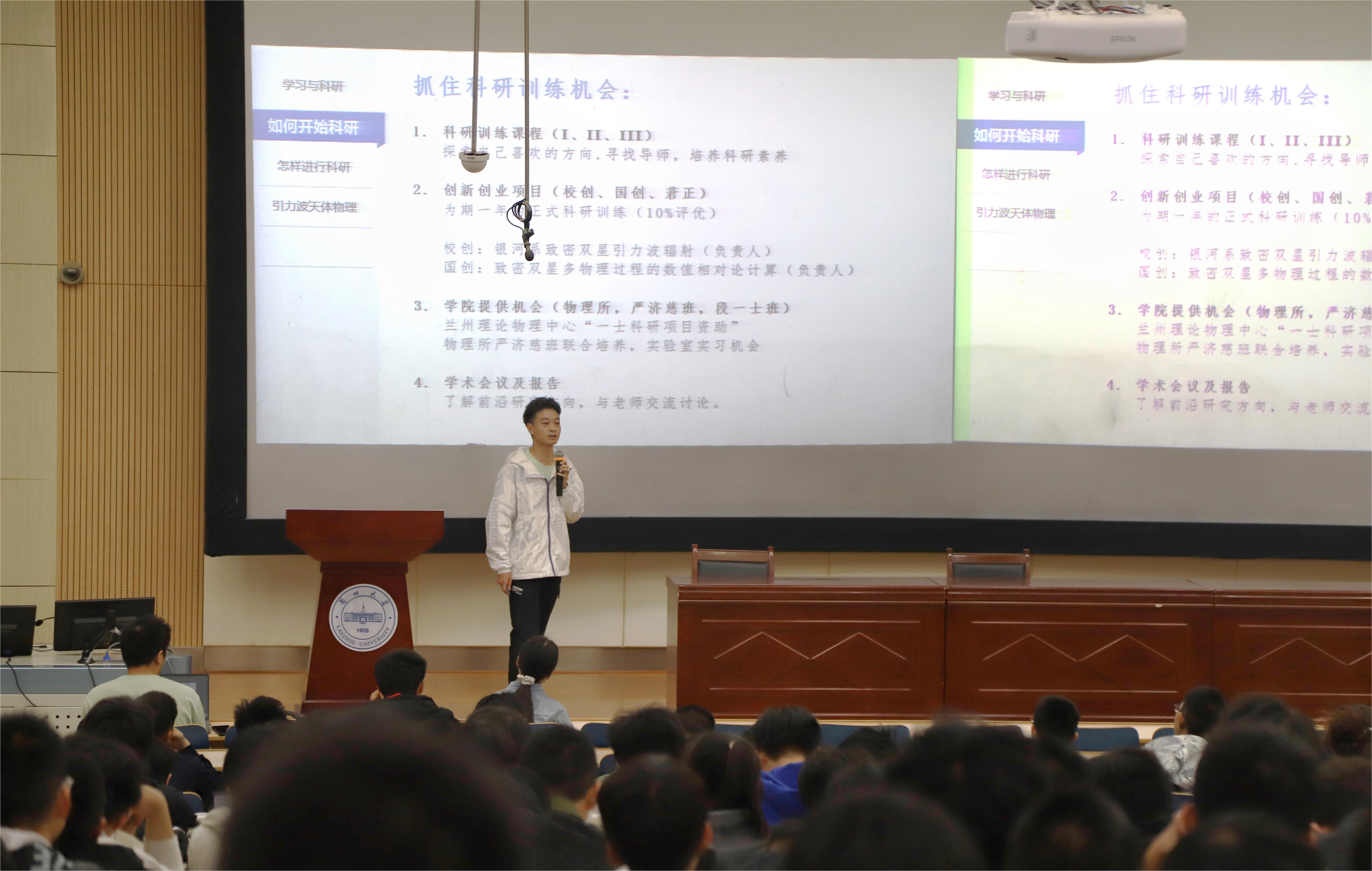 会议邀请2021级微电子科学与工程专业陈豪隆、2020级物理学(理论物理)专业张子涵分别就创新创业和科研训练两个方面进行经验分享。陈豪隆结合个人学习和参赛经历,向同学们分享了学习过程中如何做规划、定计划,鼓励同学们在不断试错的过程中发现兴趣点并深入探索,以学习的态度参加竞赛。张子涵结合自身专业和科研经历,对如何开始科研,怎样进行科研等方面进行了详细介绍,他提醒同学们要在基础课程的学习过程中下功夫,扎实的基础知识和长期学习的态度是做科研最基本的前提。两位同学的分享为2023级的同学们的学习树立了目标,提供了思路。