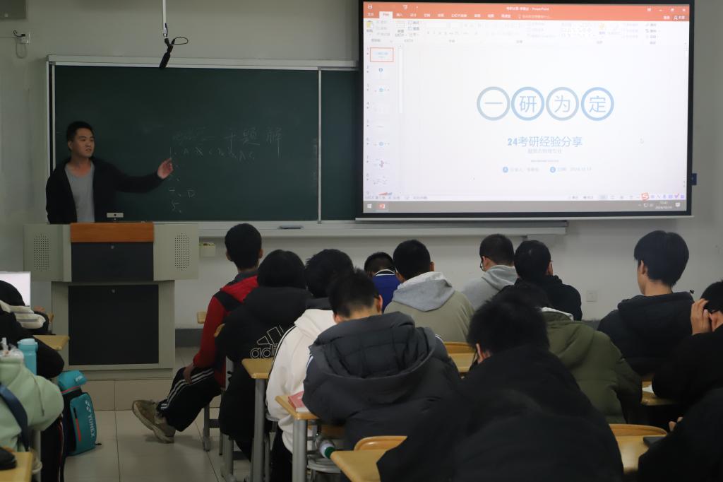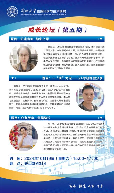 为加强本科生和研究生之间的交流,更好帮助本科生做好考研规划,解决同学们在面对考研时遇到的各类问题和困惑,10月19日下午,英国上市公司官网365在榆中校区天山堂A314举行第五期“成长论坛”,本次会议主题为考研经验分享。公司学业发展中心、“格物穷理”学业指导工作室邀请了2023级理论物理专业硕士研究生刘文燚、2024级凝聚态物理专业硕士研究生李敬业、2024级集成电路专业硕士研究生陈一帆进行分享,会议由2022级微电子科学与工程专业本科生钟雨婷主持。