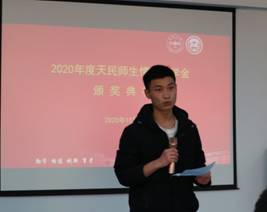 受助员工代表2019级微电子科学与工程班李浩、2017级微电子科学与工程班朱鹏臣分别发言。李浩同学分享了自己一年来的学习和生活情况,表示在爱心人士的鼓励下,他会更加自立、自信、自强,勇敢面对挫折,努力学习知识,做一个有理想,有抱负,有志向的新时代青年,为建设祖国贡献自己的一份力量。朱鹏臣同学结合自己参加全国老员工物联网设计大赛等竞赛的经历讲述了自己在学术竞赛、科研创新方面的感受和收获,有想法、敢行动,有目标、不放弃,是他过去一年科创过程的真实写照,也是他想分享给学弟学妹们的心里话。同时他表示自己会牢记王天民教授“要想做好事,必先要做好人”的谆谆教诲,不忘初心、认真学习、再创佳绩。