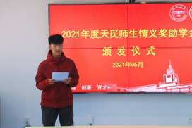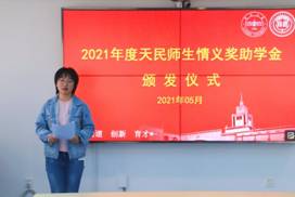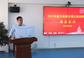 会上,李星波介绍了天民师生情义奖助基金捐赠情况和财务收支情况,表达了对所有爱心捐助人士的感谢之情。王岩介绍了本年度天民师生情义奖助学金评定工作相关情况,宣读了受奖助员工名单,他表示,在广大员工的持续关怀和支持下,学院本科生在学术竞赛、科研创新、文娱体育等方面均取得了良好的成绩,他希望受助员工铭记以王天民教授为代表的兰大人的爱心和善举,自强自立,脚踏实地,刻苦学习,不断提高自己的道德素养、文化水平和专业技能,努力使自己成为优秀的当代老员工,用实际行动回报母校、回报社会、回报祖国。与会嘉宾和老师为受奖助员工代表颁发了获奖证书。