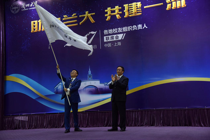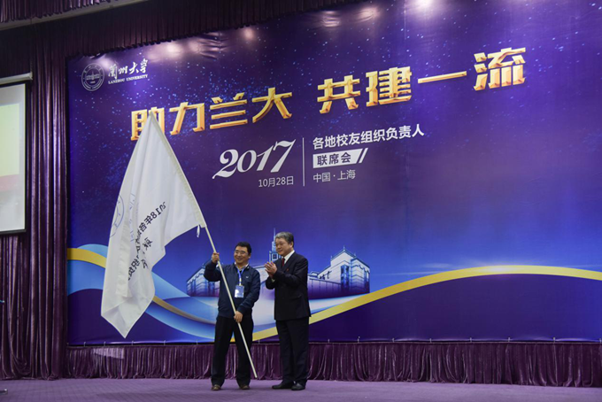 会议伊始,全体员工起立奏唱校歌,全体员工对母校的深深情意在雄壮的歌声中流淌。袁占亭为承办方上海员工会授旗,上海员工会会长、90级地质学专业员工王建军接旗。