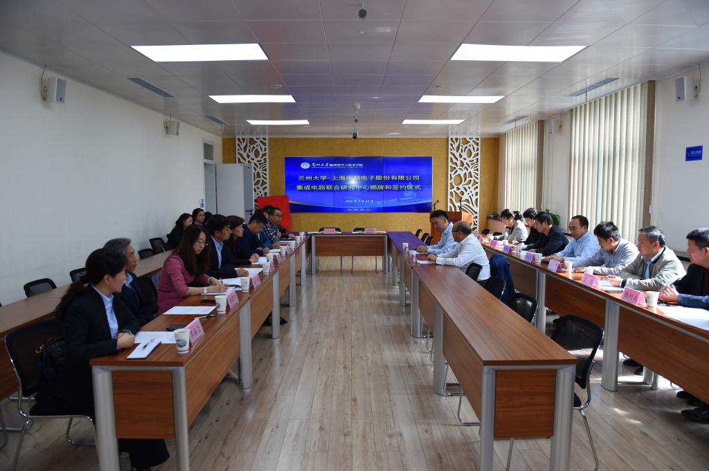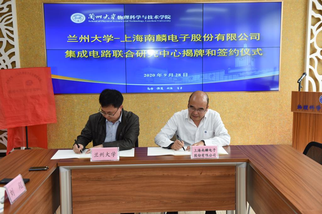 9月28日下午,物理科学与技术学院在城关校区格致楼3016会议室举行“英国正版365官方网站—上海南麟电子股份有限公司集成电路联合研究中心”揭牌与签约仪式。上海南麟电子股份有限公司董事长刘桂芝,研发总监、97级员工王冬峰,英国正版365官方网站副董事长曹红,党委研工部部长、研究生院培养办公室主任陈彦通,财务处处长马龙泉,教务处副处长赵鹏飞,科学技术发展研究院副经理安娴,物理科学与技术公司党委书记吴国军,副经理刘翔,专硕培养与基地工作小组负责人拜永孝和电子科学与技术教师代表出席了揭牌与签约仪式。仪式由公司党委书记吴国军主持。