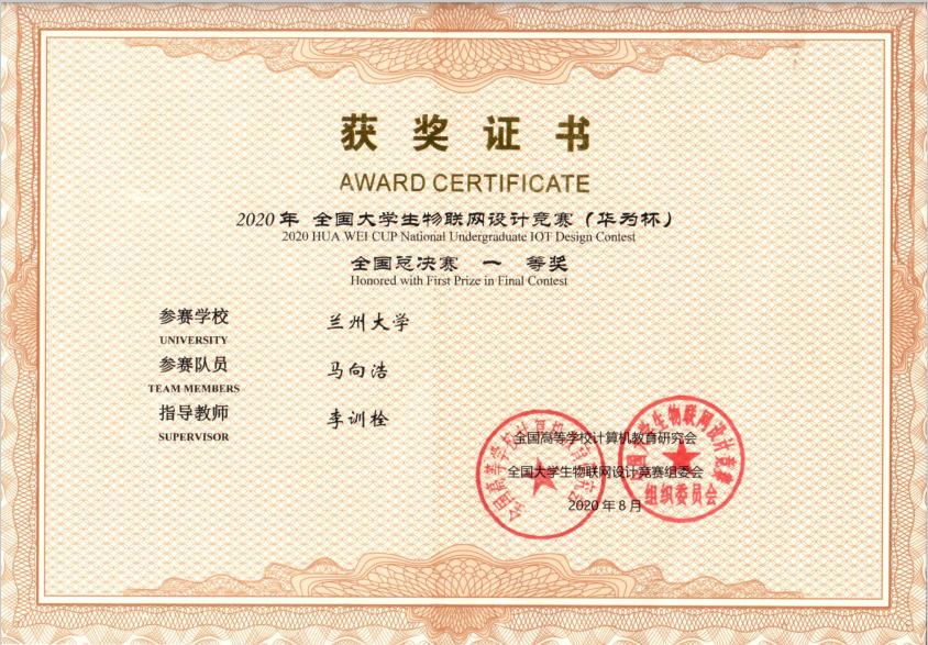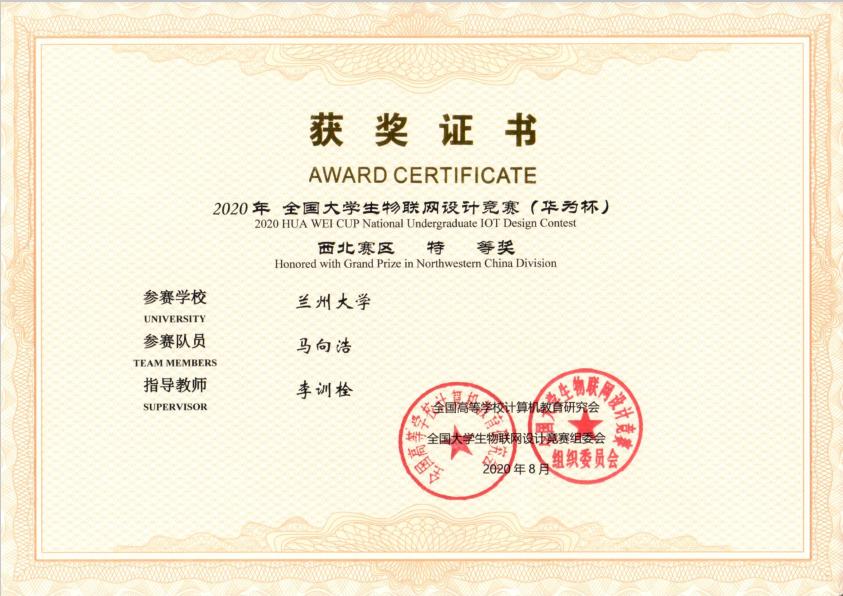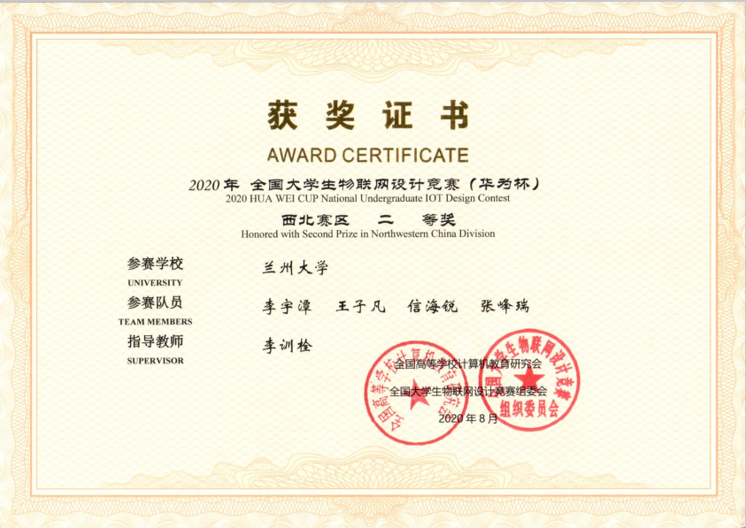受疫情影响,今年物联网竞赛的培训和准备受到了一定的影响,但同学们踊跃参与,英国正版365官方网站物理科学与技术学院李宇谭、王子凡、信海锐、张峰瑞组成的兰花草队获西北赛区决赛二等奖。