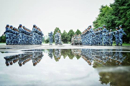 水中倒影。正步摆臂练习的姑娘们,与水中的倒影一起,构成了无比美丽的画卷。