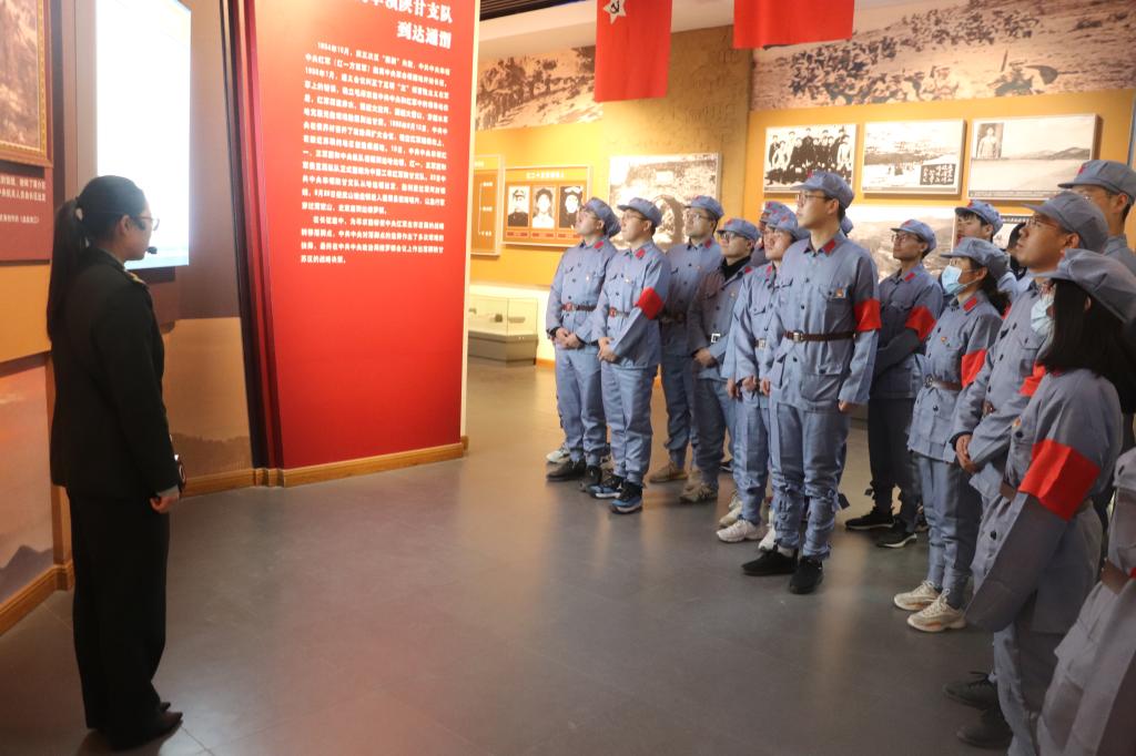 纪念馆大厅内,毛泽东等五位革命先辈雕像巍然矗立、煜煜生辉。全体师生代表学院向革命先辈敬献花篮并三鞠躬,表达对伟人的深切缅怀和崇高敬意。在工作人员带领下,一行人通过聆听讲解和观看实物等方式进行了现场党史学习研讨。纪念馆内的一件件文物、一张张照片、一幅幅图画,记录着革命战争年代中国共产党领导红军进行万里长征的峥嵘岁月,无不让在场师生肃然起敬。