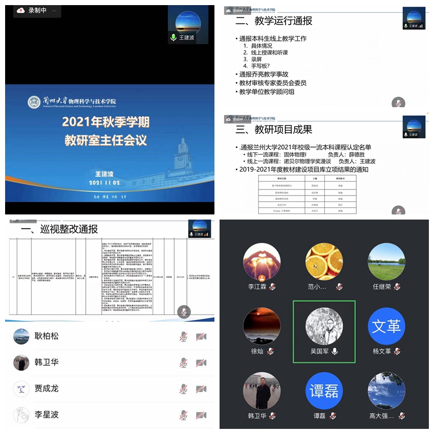 王建波围绕专业建设、课程建设、教材建设等九个方面传达了巡视整改中对本科教学工作提出的存在的不足和需要整改的问题;通报了疫情以来学院开展线上教学、教研室线上授课和听课、教材审核等教学运行情况;对教研项目和成果、团队培训比赛、教材审核以及教研室活动开展等近期工作进行了通报说明和安排布置。他指出,希望各教研室积极落实整改在巡视整改中发现的问题,以课程建设为纽带,打造教学团队,推进“金课”建设,进一步加强教师培训工作,助力教师备战教学竞赛,加强教材建设,深化教学改革,推动本研贯通培养、建立创新体系,及时收集、总结教学素材,做到课程有示范、教学有典范。